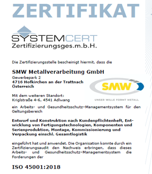 Im September wurde SMW erfolgreich nach ISO 45001 zertifiziert – dem international anerkannten Standard für Arbeitsschutzmanagementsysteme.